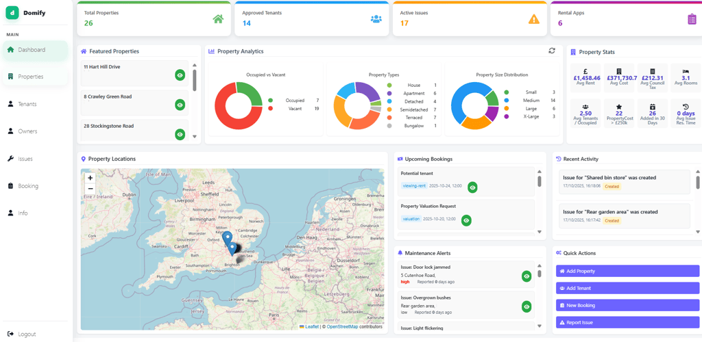 Streamline your operations effortlessly.Domify is an all-in-one property management platform designed to make renting and management effortless. It helps landlords and agents list properties, manage tenants, track payments, and handle maintenance — all from one simple dashboard. Tenants can easily pay rent, report issues, and stay updated through their own portal. With a clean, modern design and smart automation, Domify saves time, reduces paperwork, and keeps everyone connected.